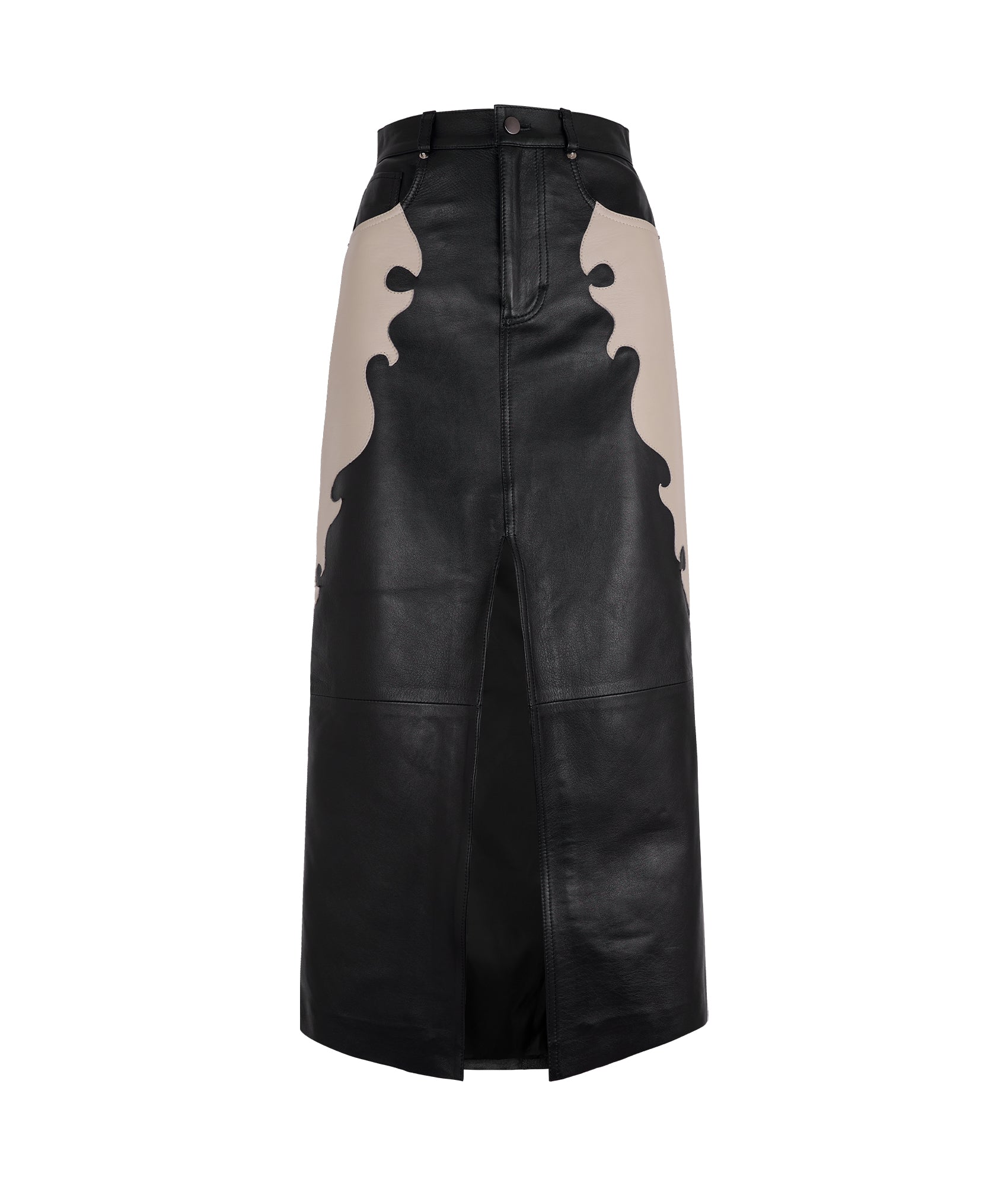 Falda larga de piel negra con aplicaciones color hueso a los costados.