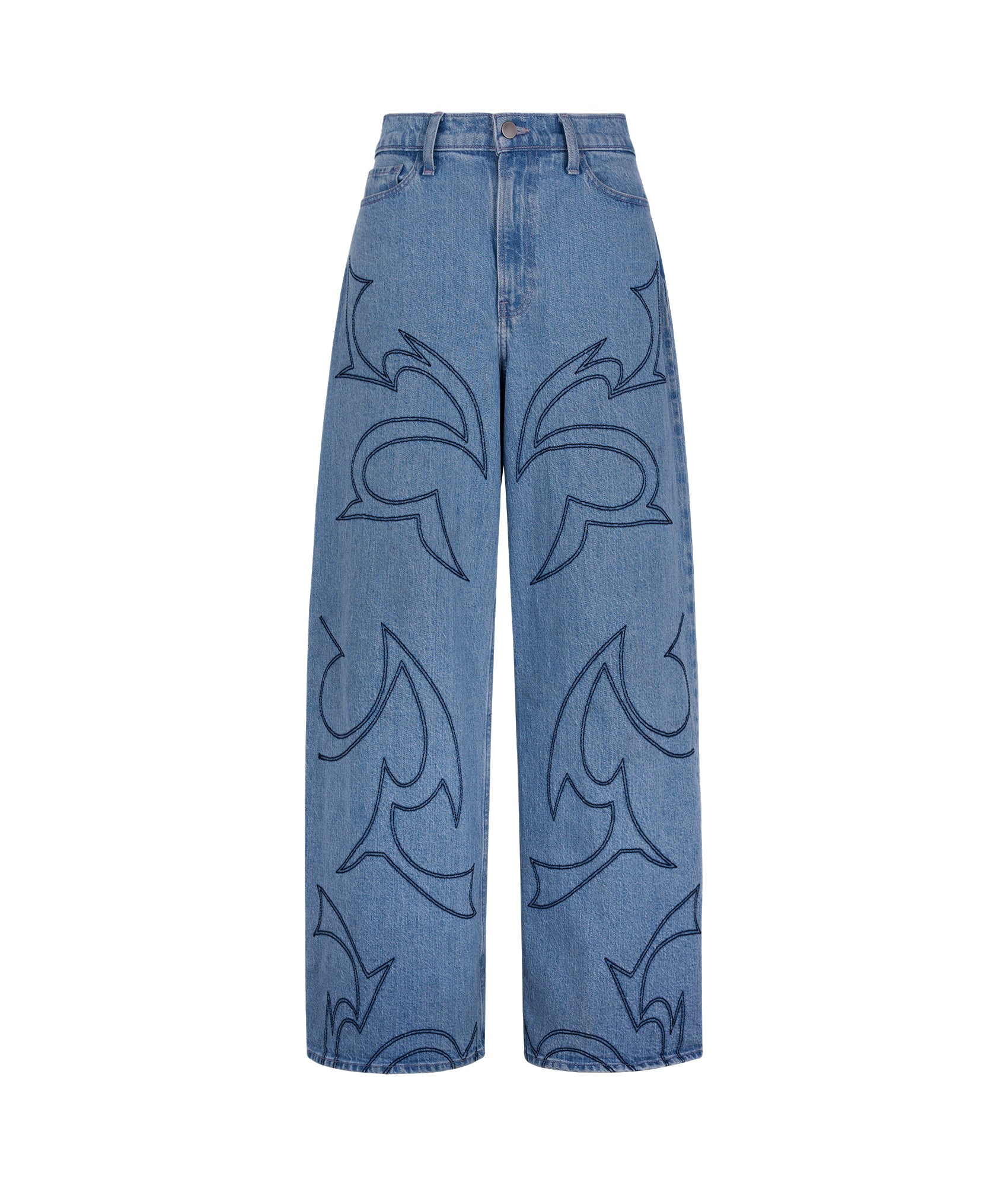 Jeans de mezclilla clara con corte wide-leg y tiro alto, decorados con elegantes bordados de grecas ornamentales en azul oscuro que recorren toda la prenda.