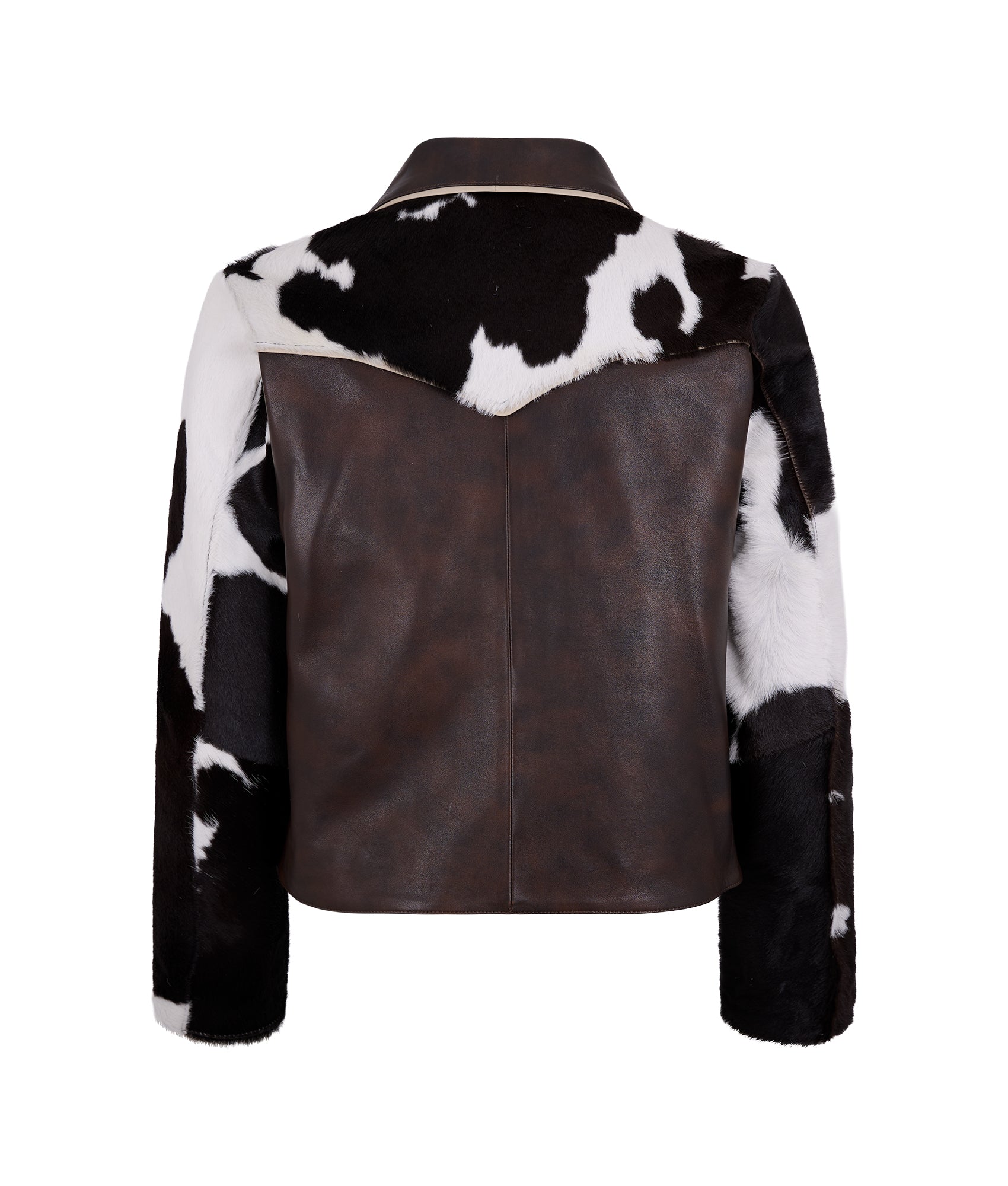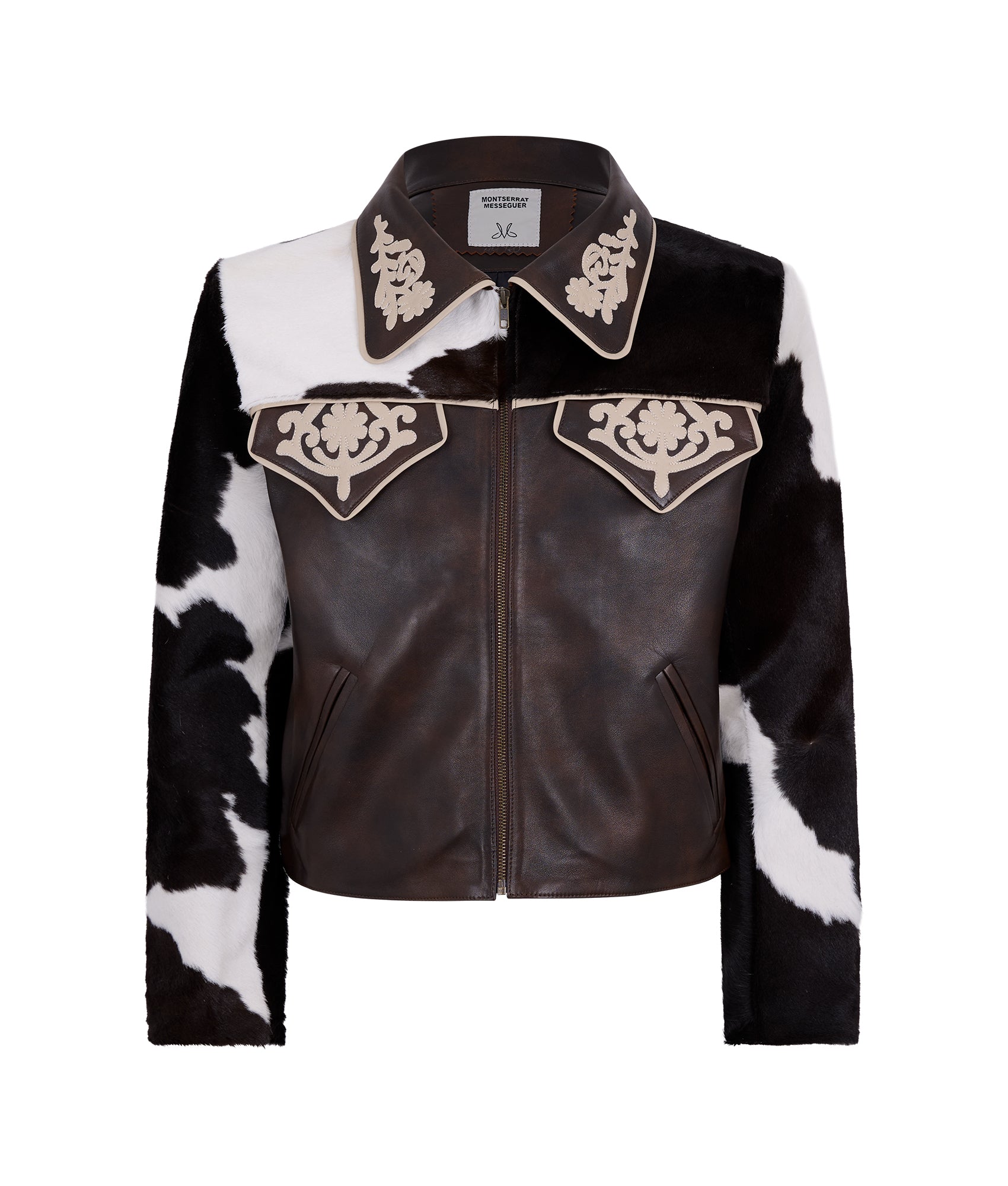 Chamarra clásica Pockets de piel lustrada color café y calf-hair moteado con detalles de piel inspirados en la cuera tamaulipeca