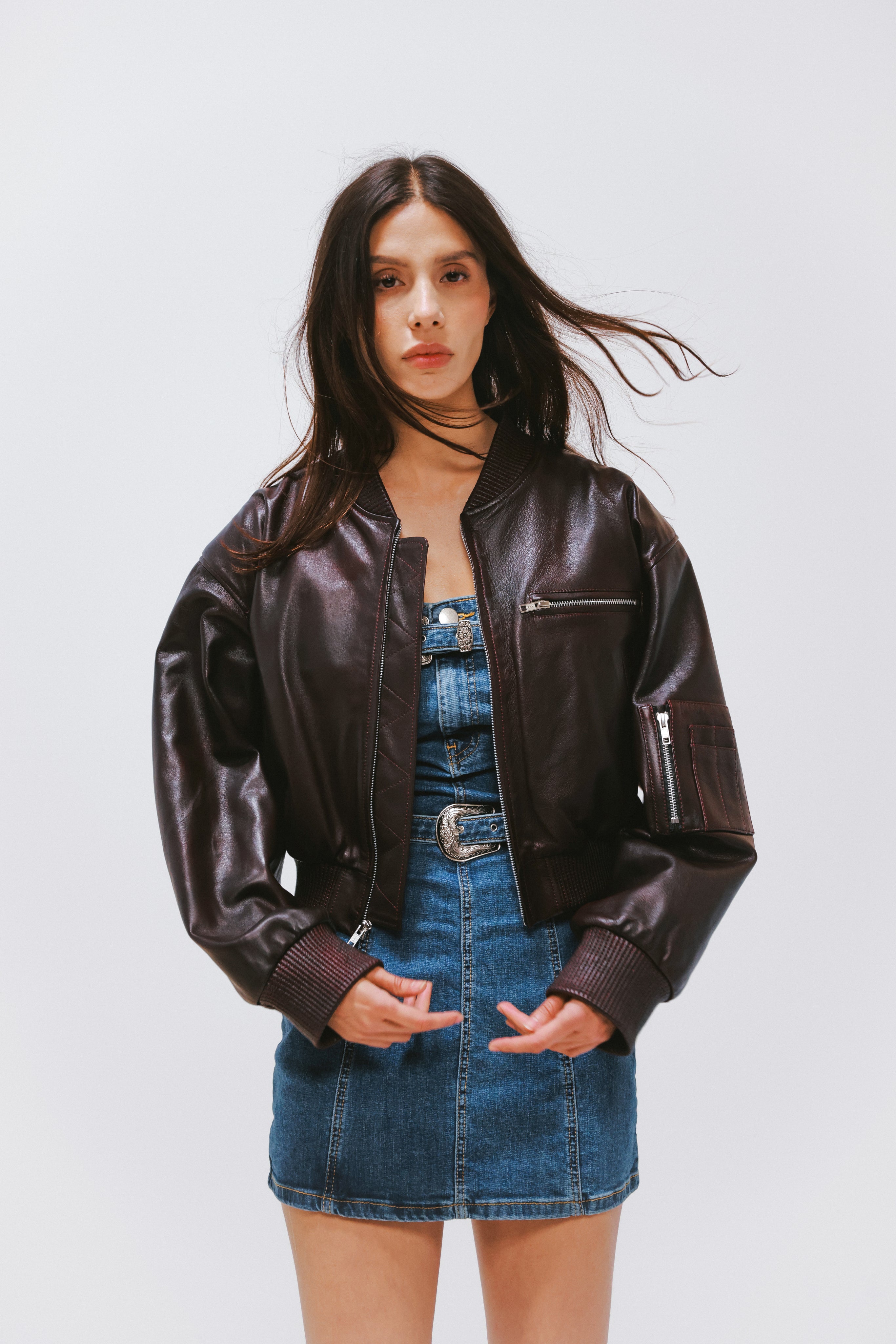 Bomber Jacket corta de piel lustrada color vino, cardigan en puños, cuello y cintura de piel.