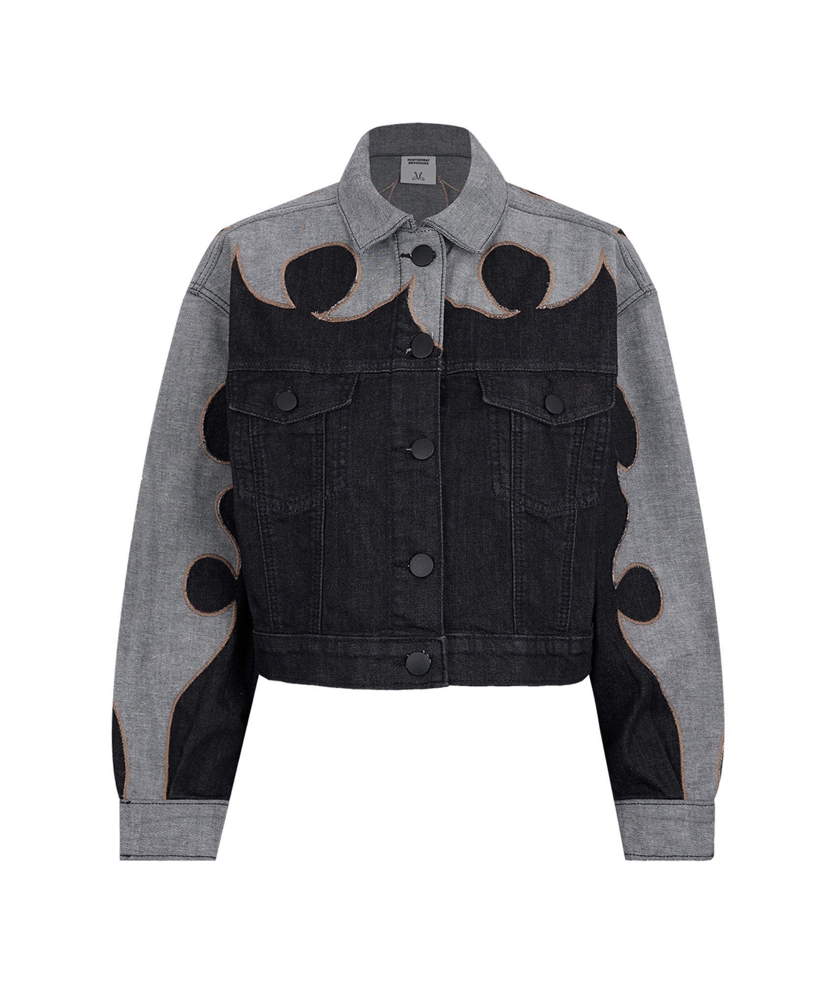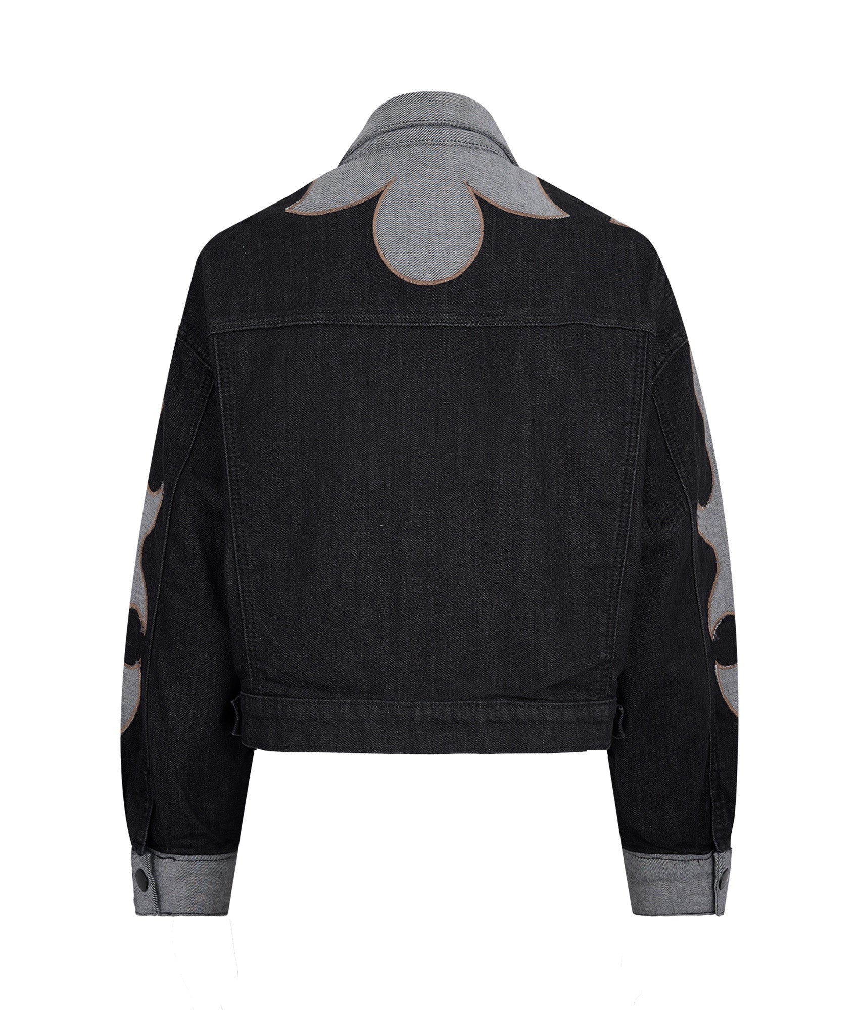 Chaqueta de mezclilla negra con aplicaciones en contraste y bordado.