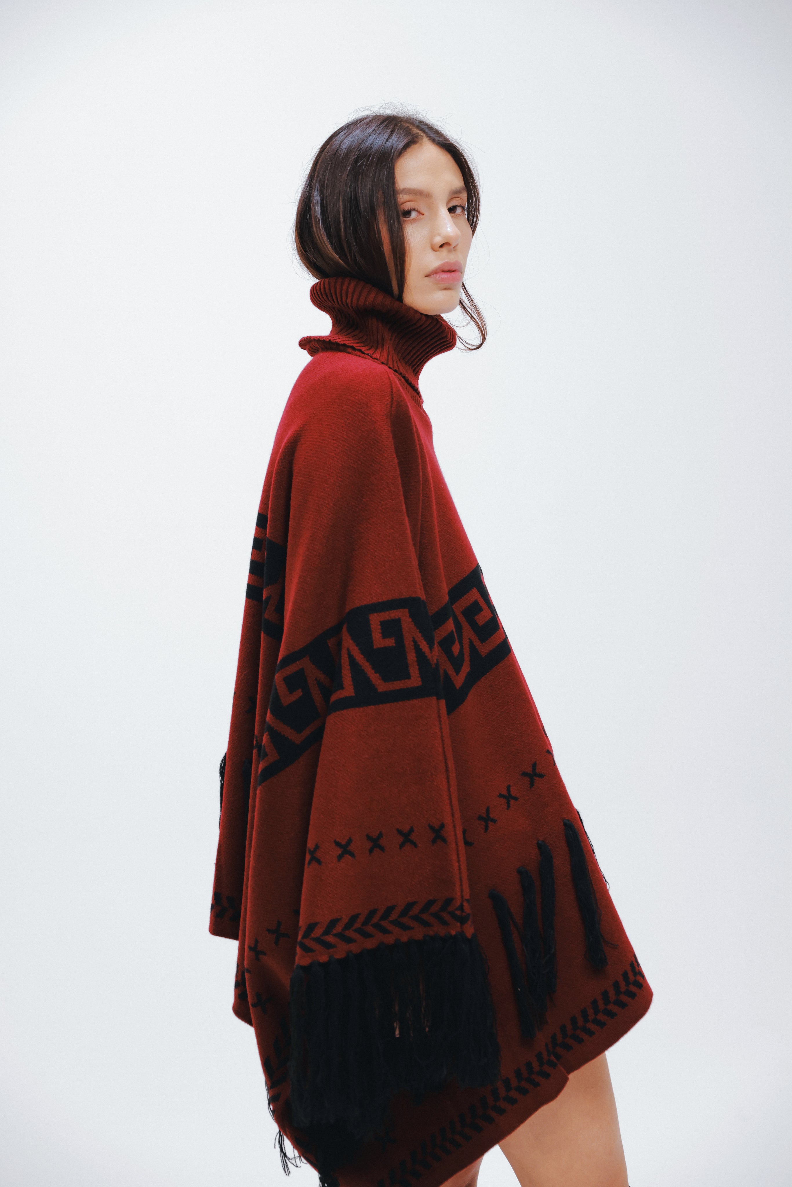 Poncho cerrado de cuello de tortuga color vino con grecas color negro
