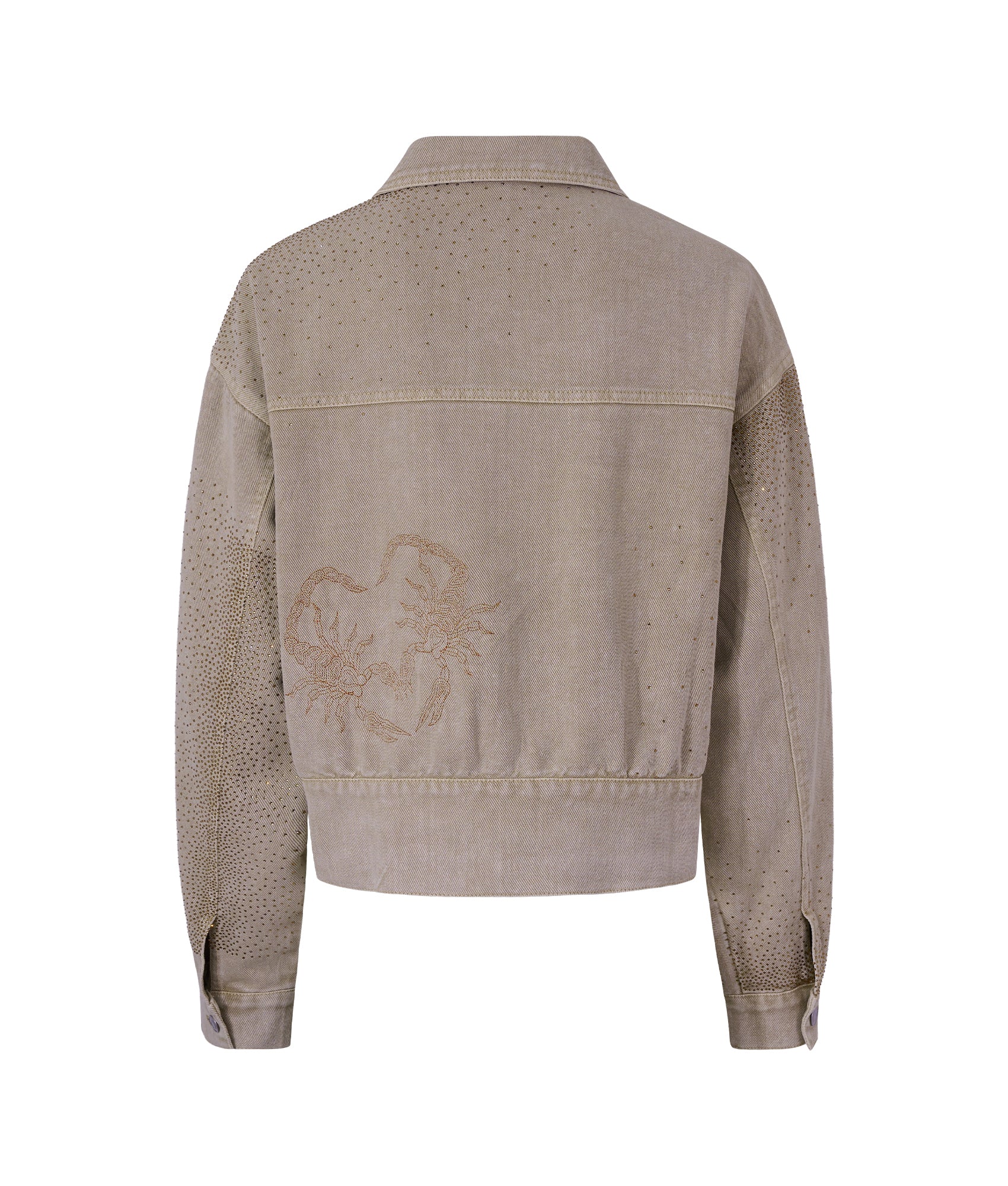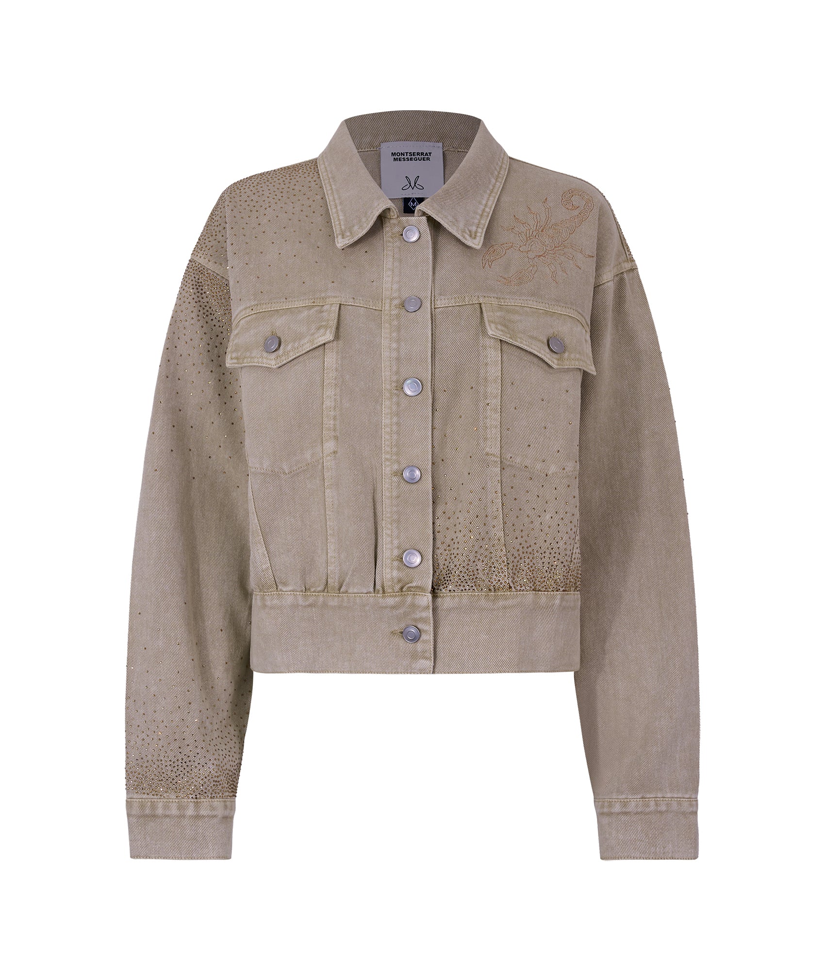 Chamarra cropped en denim beige con bordado de alacrán en pecho y espalda, detalles de estoperoles y cristales dorados. Botones metálicos al frente y banda elástica posterior para ajuste cómodo.