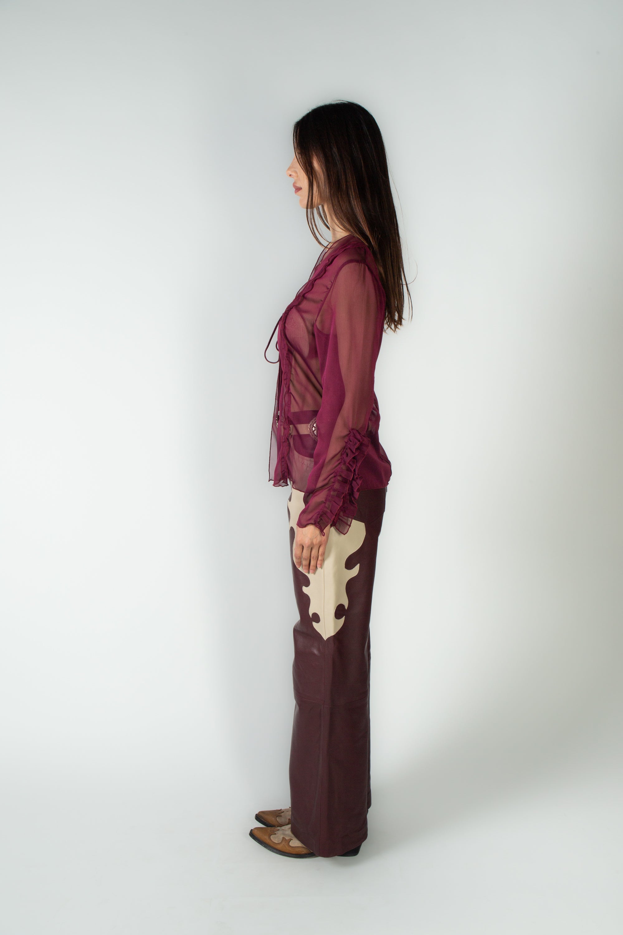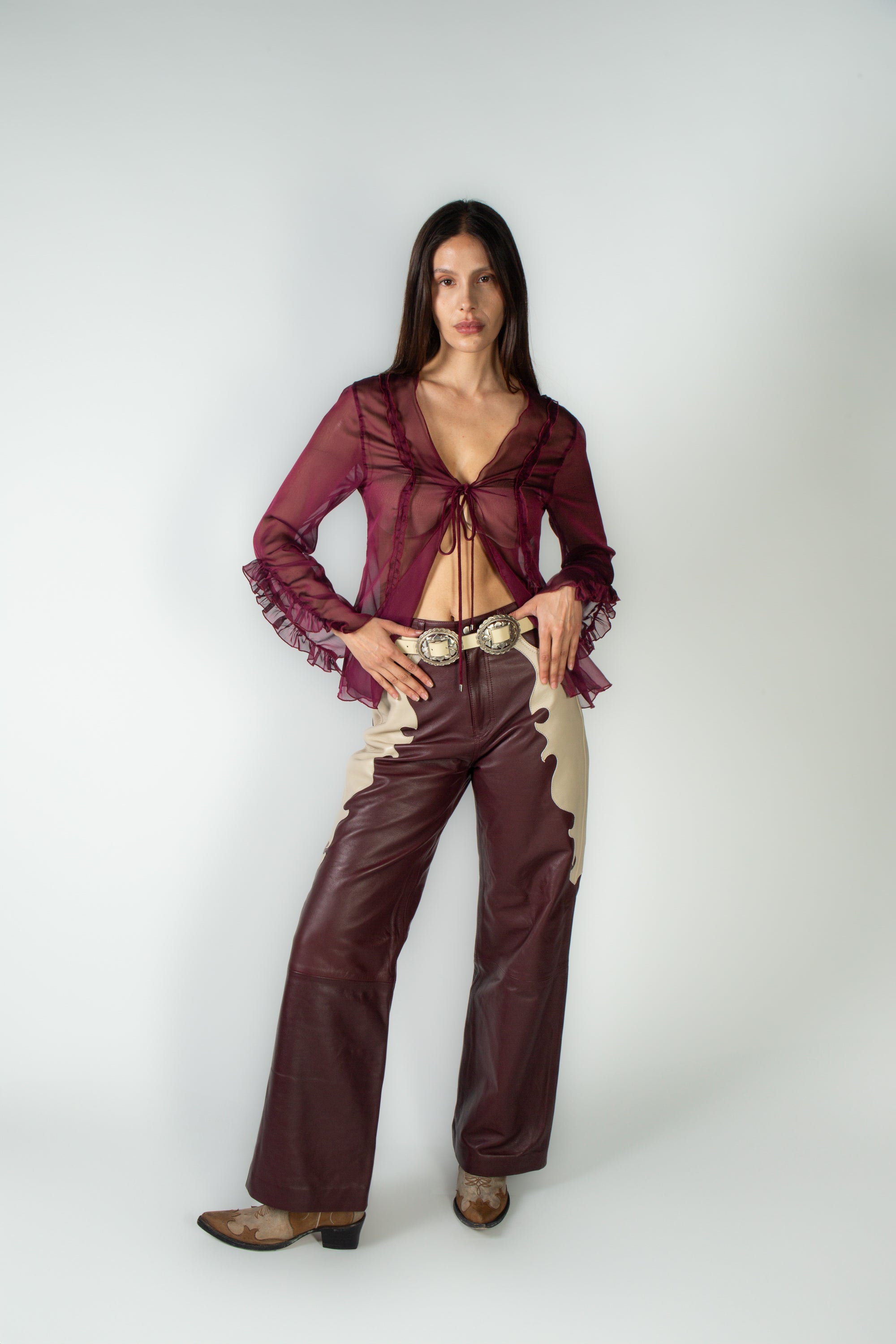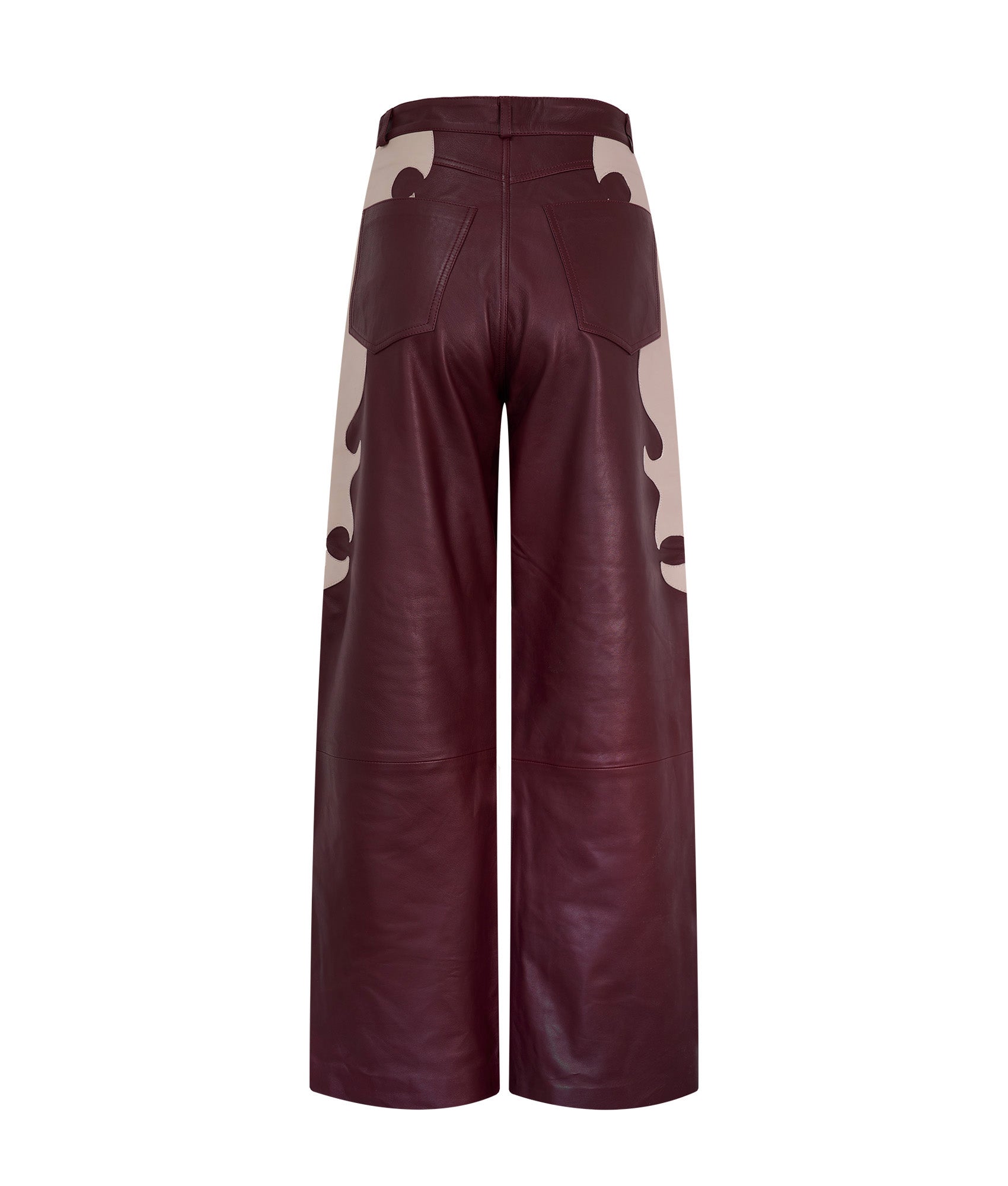 Pantalón tipo western, pierna ancha, confeccionado en 100% piel color vino, con detalles laterales en hueso.