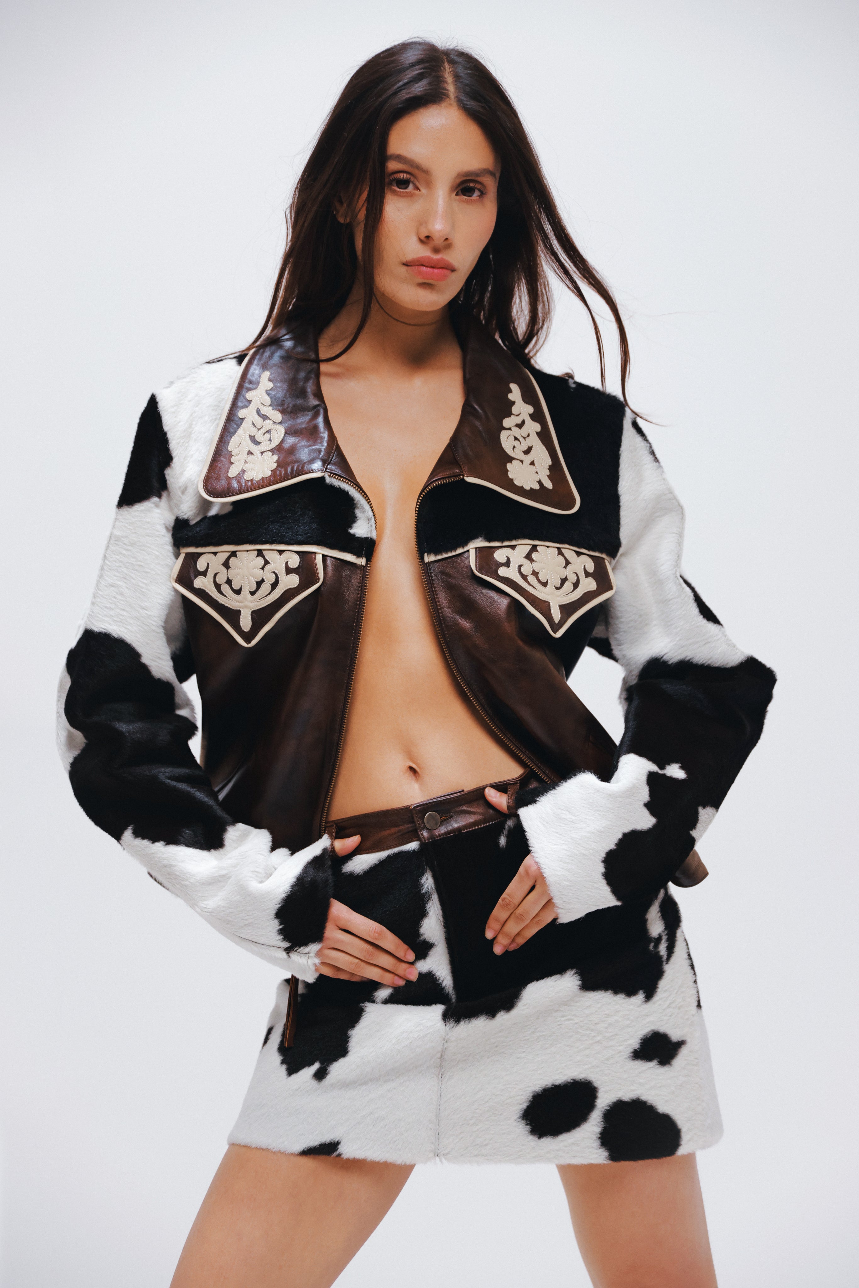Classic Pockets jacket in polished leather and mottled calf-hair with leather details inspired by Tamaulipas leather.